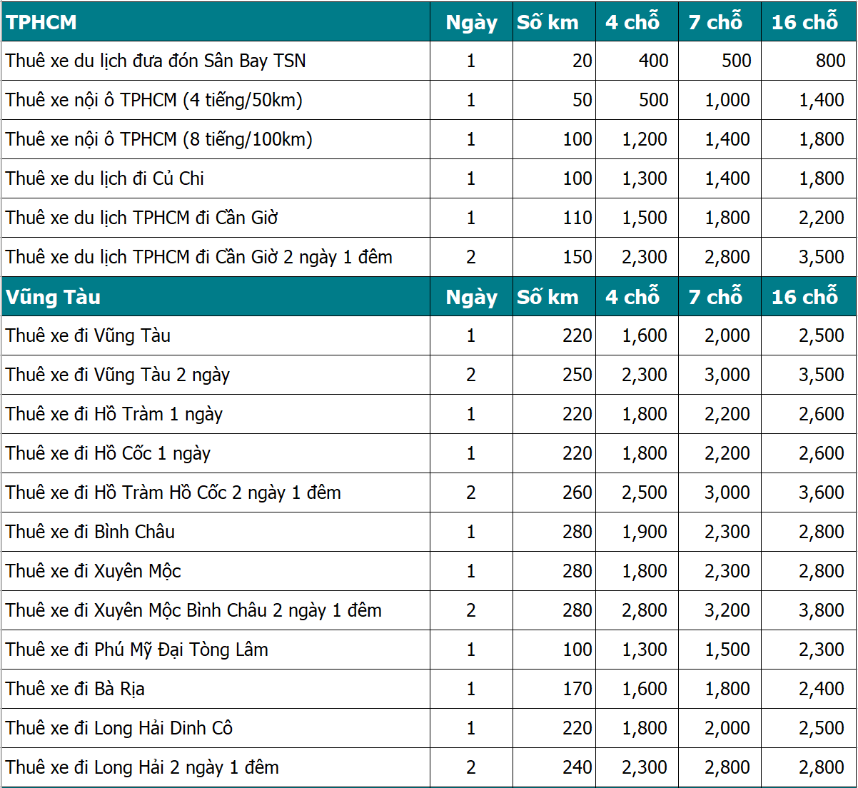 BẢNG GIÁ CHO THUÊ XE DU LỊCH TẠI TP.HCM